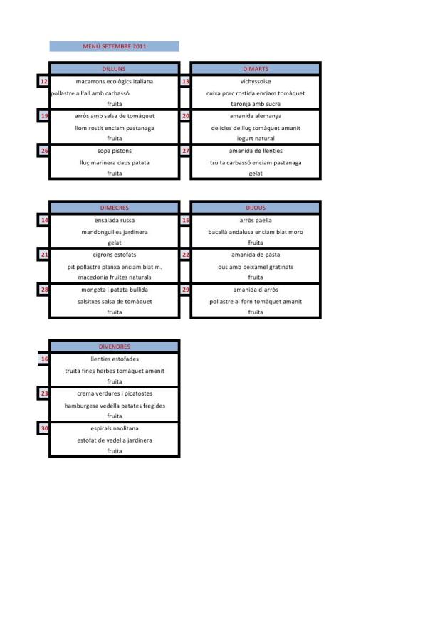 Mònica 27 Setembre 2011 a les 19:04 Per que no s’ha donat el menú fotocopiat als pares com sempre? el mes que ve també hauré d’esperar es pengi al bloc per veure que menja la meva filla?com es que no em rebut el menú? gràcies Respon ↓