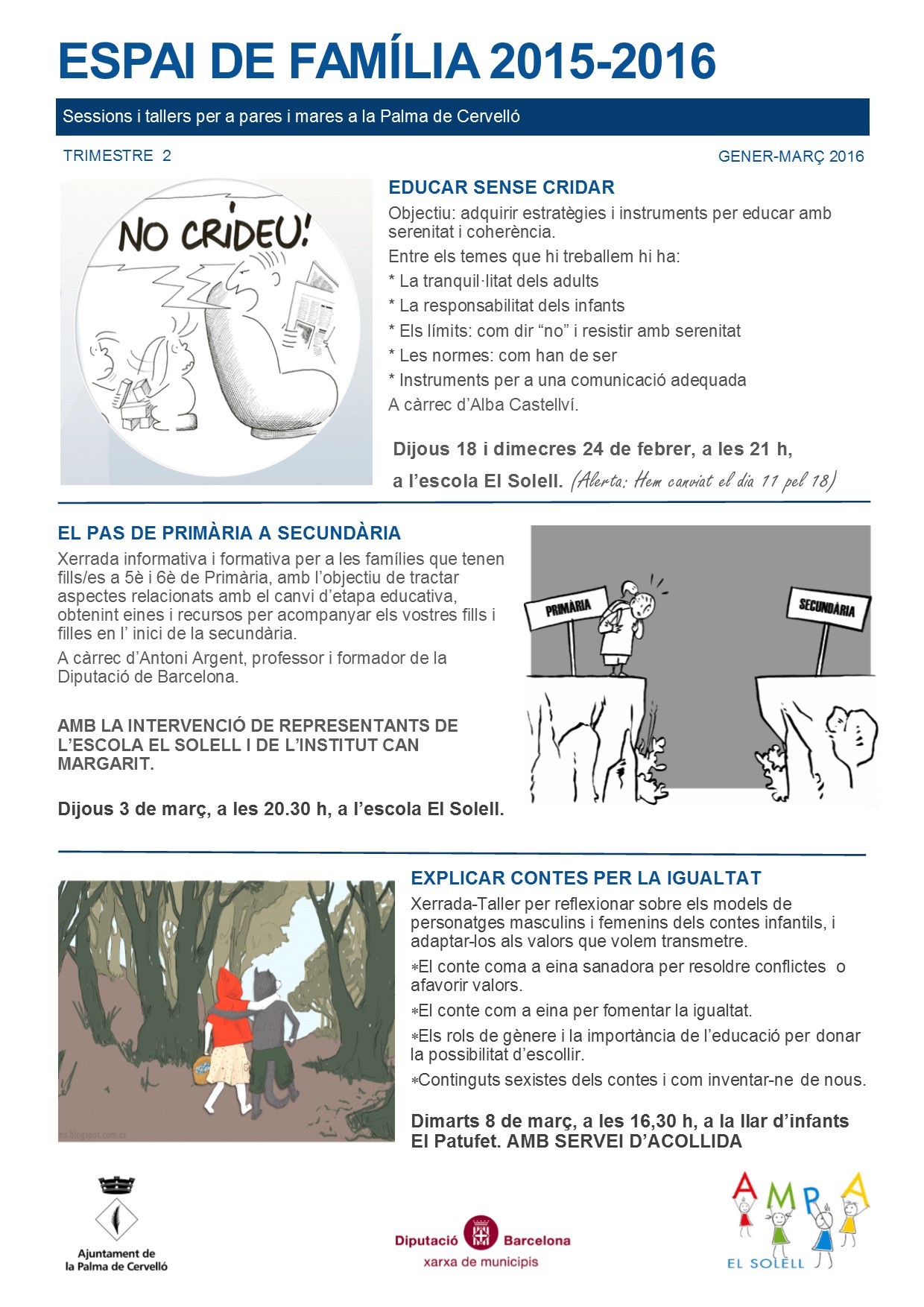 La primera sessió de l’Espai de família d’aquest segon trimestre, que organitza l’AMPA conjuntament amb l’Ajuntament de la Palma de Cervelló i amb la col·laboració de la Diputació de Barcelona, serà avui dijous a l’escola el Solell: