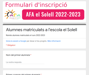Qualsevol consulta o dubte relacionat amb la inscripció a l’AFA el Solell per al curs 2022-2023 podeu adreçar-vos a afa@afaelsolell.cat.