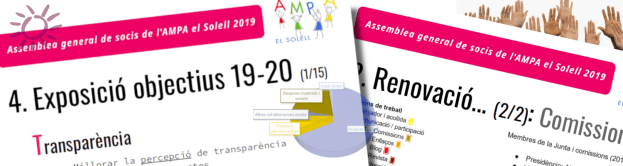 Tant els enllaços a la presentació que va utilitzar-se per realitzar l’Assemblea general anual de socis de l’AMPA com la graella d’objectius que forma part de la Programació general anual del curs 2019-2010 els trobareu a la pàgina de «Transparència» que hem inaugurat aquest curs.