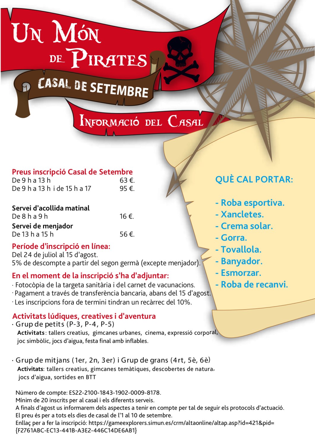 - L’AMPA enguany organitza amb l’empresa Dacor un casal per les primeres setmanes de setembre. Poden participar-hi nens i nenes des de P3 fins a 2n d’ESO en horari de 9h a 17h (ampliable amb acollides i casal de tarda fins a 7:45h a 17h). Les inscripcions són del 16 de juny al 28 de juliol. Per més informació contacteu amb l’AMPA o directament amb dacoreducacio@gmail.com.
